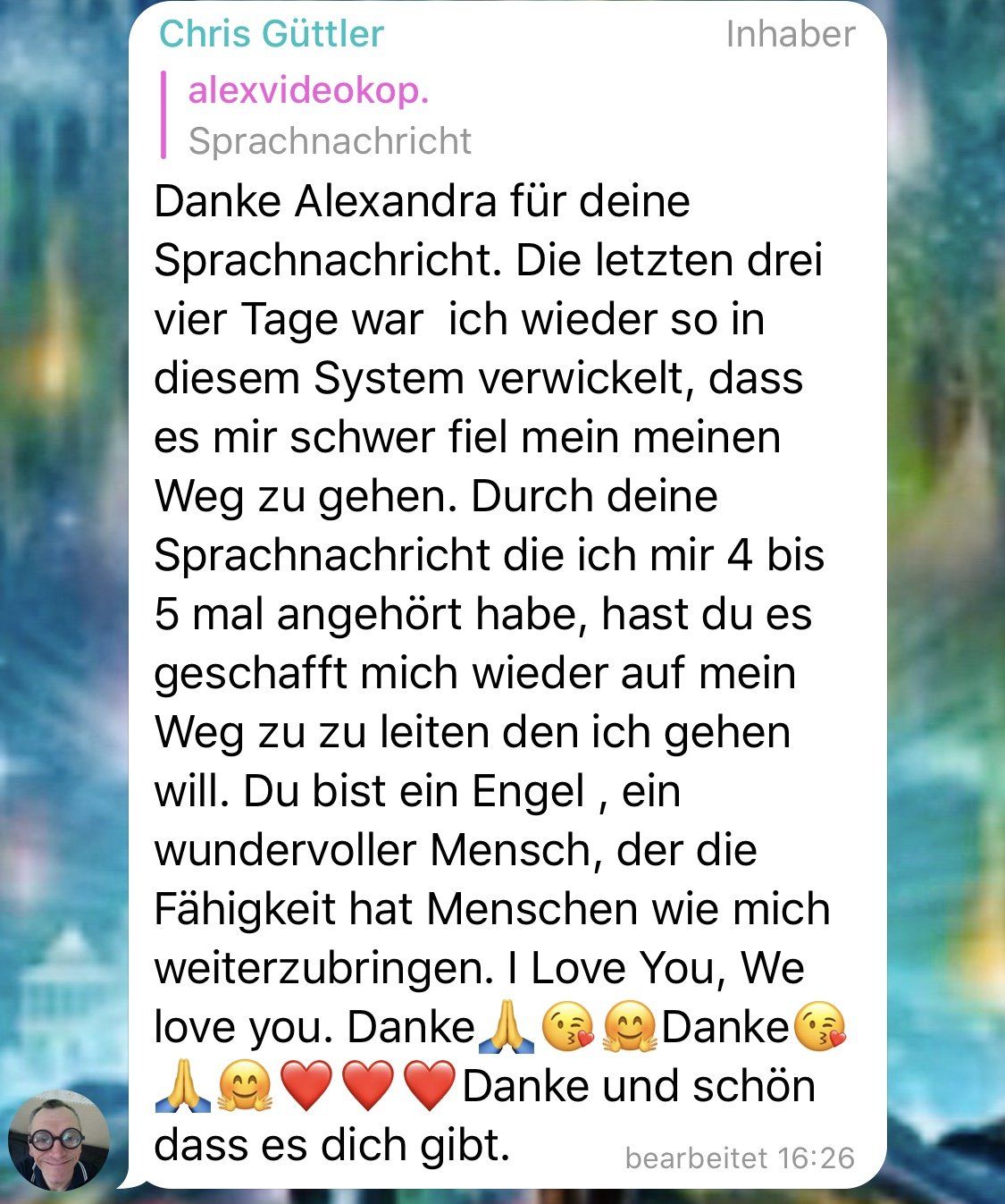 Bedenke immer: "Deine Welt ist ein Spiegel deiner Glaubenssätze, deines Bewusstseins, deiner Frequenz und deiner Handlungen, es gibt keine Opfer. Liebe soviel du kannst von wo aus auch immer, habe keinen Widerstand und übernimm Verantwortung für dein Erleben welches unter anderem durch deine Entscheidungen, bewusst oder unbewusst, entsteht."